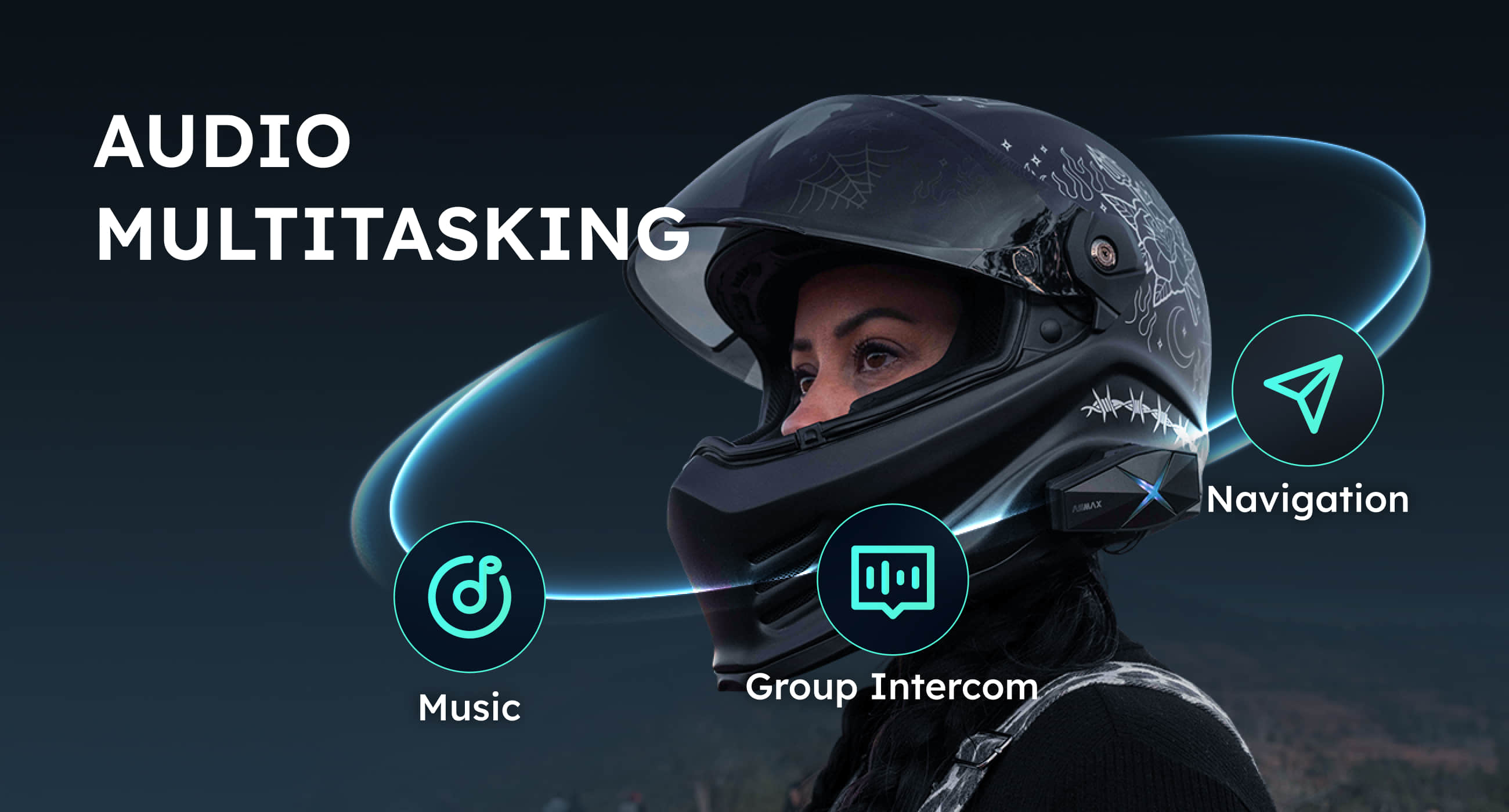 ASMAX F1 helmet communication systems features audio multitasking that enables simultaneous enjoyment of music and group intercom or GPS navigation.