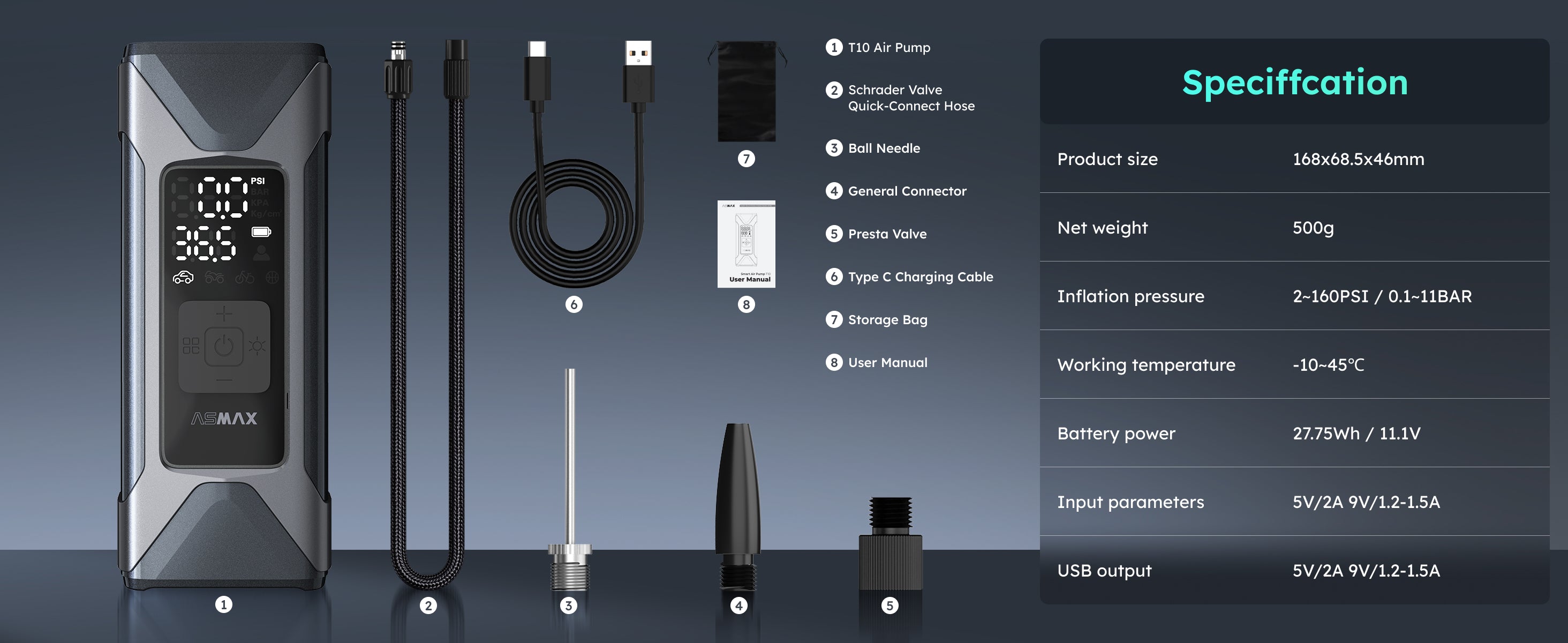 The T10 supports five inflation modes and is suitable for cars, motorcycles, bicycles, balls, and more.